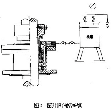 雙端面密封阻封液的注入方法,也經(jīng)過詳細的考慮和計算。密封腔裝在塔高27m的塔頂處,安裝1條阻封液管線,不僅工作量大,而且不經(jīng)濟。考慮到轉(zhuǎn)盤塔的轉(zhuǎn)速為0.5r/s,摩擦熱量和攪拌熱量均比較小,所以改用固定式氣壓注油法代替阻封液管線,見圖2。