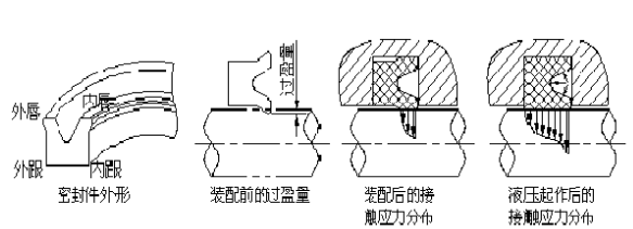 Y形密封圈的截面呈Y形,是一種典型的唇形密封圈。結(jié)構(gòu)簡單、安裝簡單,使用壓力較高(高可達40Mpa),密封性能良好,密封性能隨壓力升高而提高,并能自動補償磨損量,摩擦力小,成本低,對油缸的表面要求也不高,是液壓缸使用廣泛的一種密封圈。按其截面的高、寬比例不同,可分為寬型、窄型、Yx型(兩唇不等高)等幾類,Y形密封圈依靠其張開的唇邊貼于密封副耦合面,并呈線狀接觸,在介質(zhì)壓力作用下產(chǎn)生“峰值”接觸應力,壓力越高,應力越大。當耦合件以工作速度相對運動時,在密封唇與滑移耦合面之間形成一層密封液膜,從而產(chǎn)生密封作用(如圖3)。密封唇邊磨損后,由于介質(zhì)壓力的作用而具有一定的自動補償能力。寬型Y型圈一般適用于壓力小于20Mpa、工作溫度-30~100度、速度小于0.5米/秒的場合。窄型圈是寬型Y圈的改型產(chǎn)品,其截面長寬比在2以上,不易翻邊,穩(wěn)定性好。Yx型是窄型Y圈中不等高唇型號,有孔用和軸用之分,其短唇與密封面接觸,滑動摩擦力小,耐磨性好,壽命長,長唇與非運動表面有較大預壓縮量,摩擦阻力大,工作時不竄動。安裝 Y形密封圈時,唇口一定要對著壓力高的一側(cè),才能起密封作用?;钊肶型Yx型)活塞上都要安裝導向環(huán),主要作用是 引導活塞做直線運動,防止活塞因受力不均造成的走偏導致內(nèi)漏和減少密封件使用壽命等現(xiàn)象。