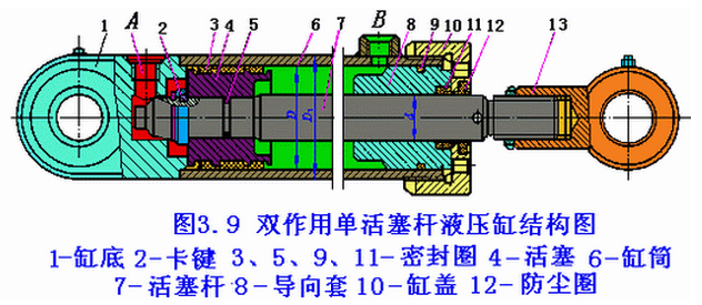 上圖給出了雙作用單活塞桿液壓缸的結(jié)構(gòu)圖,該液壓缸主要由1缸底、6缸筒、10缸蓋、4活塞、7活塞桿和8導(dǎo)向套等組成;缸筒一端與液壓缸底焊接,另一端與液壓缸蓋采用螺紋連接?;钊c活塞桿采用卡鍵連接,為了確保液壓缸的可靠密封,在相應(yīng)位置設(shè)置了密封圈3、5、9、11和12防塵圈密封件。