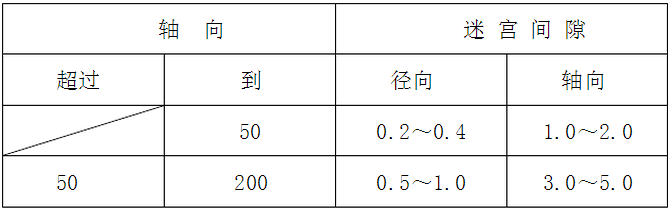 在軸向組合成凹凸式迷宮通路的密封,多用于整體式軸承箱。徑向組合成凹凸式通路的迷宮密封,多用于剖分式軸承箱。軸有傾斜時(shí),迷宮通路亦傾斜設(shè)置,以免凹凸部相互干涉。迷宮式密封,多用于剖分式軸承箱。軸有傾斜時(shí),迷宮通路亦傾斜設(shè)置,以免凹凸部相互干涉。迷宮式密封的徑向及軸向間隙,通常采用下表所示值: