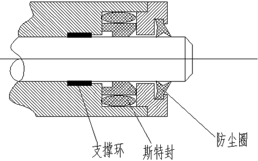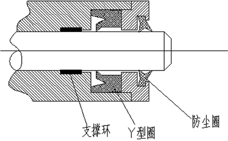 同活塞一樣,活塞桿處密封使用Y型圈也比較多,活塞使用孔用Yx型密封圈,這里使用軸用Yx型密封圈,該處密封常有形式是支撐環(huán)+ Yx型密封圈+防塵圈,支撐環(huán)安裝在液壓缸端蓋內(nèi)側(cè),主要作用是支撐活塞桿;防止活塞桿不垂直受力給桿密封帶來的承壓不均勻造成的密封效果差和使用壽命短等作用。 同活塞上導(dǎo)向帶一樣,活塞導(dǎo)向帶和活塞桿支撐環(huán)的使用壽命直接影響到活塞密封和活塞桿密封的使用效果與壽命,所以對導(dǎo)向帶和支撐環(huán)的要求也較高,比如摩擦系數(shù)小,硬度高,使用壽命長等。
