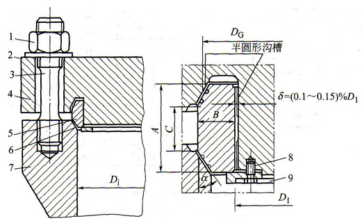 (1一主螺母;2-墊圈;3--主螺栓;4-平蓋;5--雙錐環(huán);6-軟金屬墊片;-筒體端部;8-螺栓;9-托環(huán))